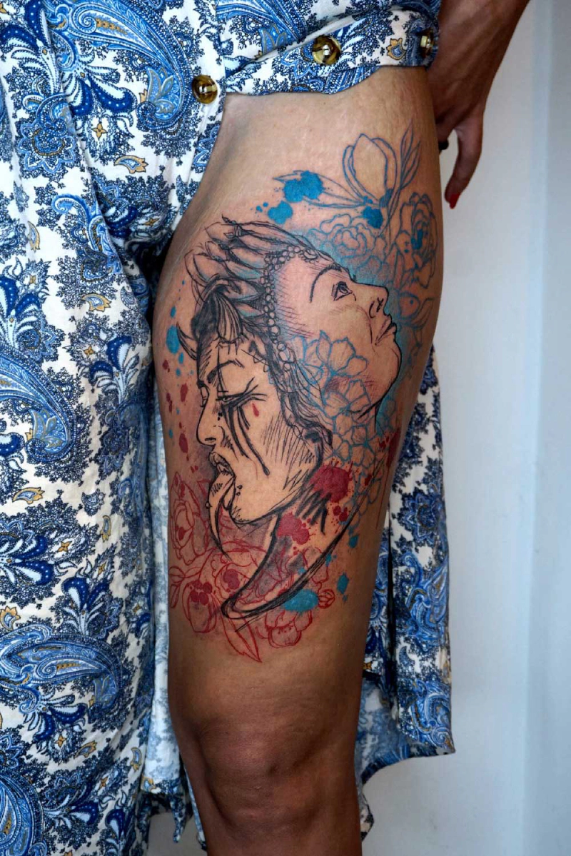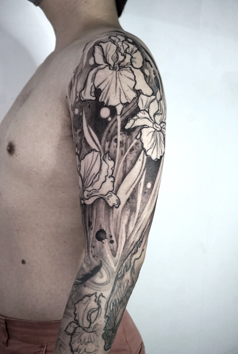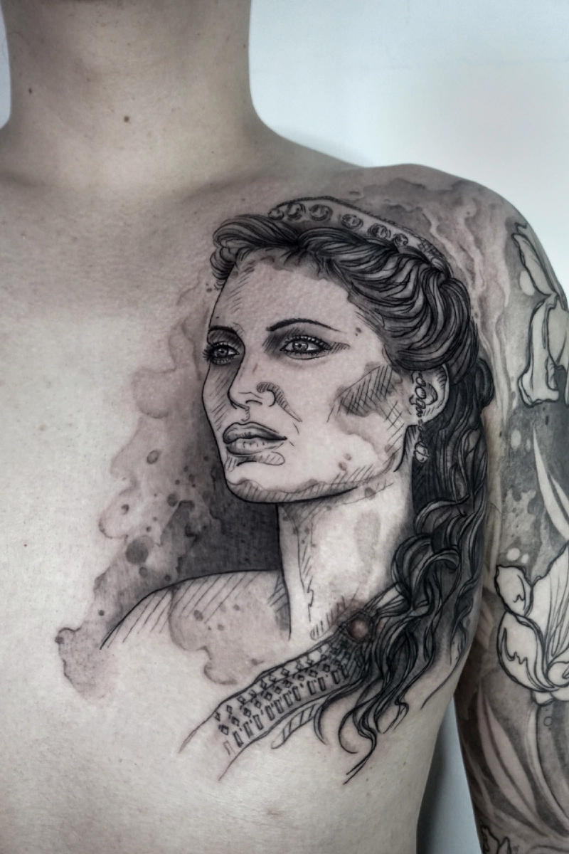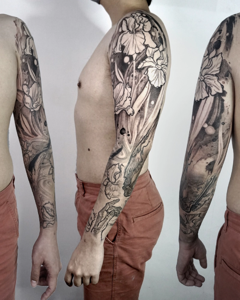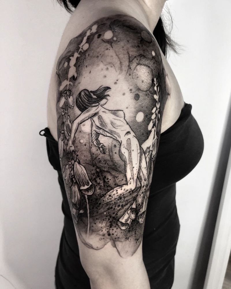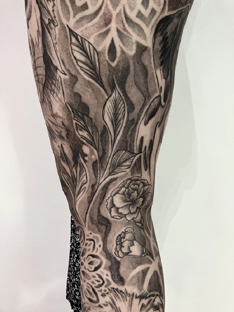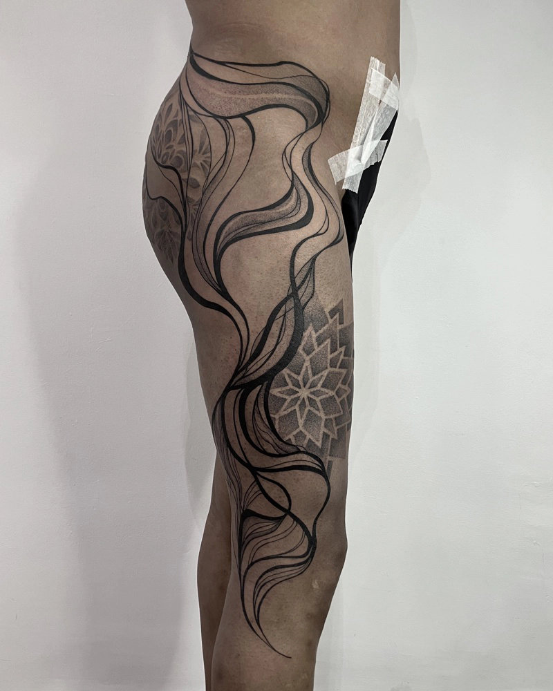 These tattoos are custom designs created in collaboration with each client. Sometimes people come with a clear idea, sometimes just with a theme or feeling. Together we shape it into a design that fits their body and story. Each piece is drawn by hand and tailored to the person who carries it.