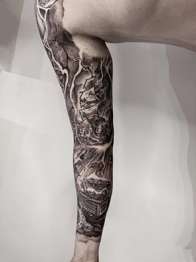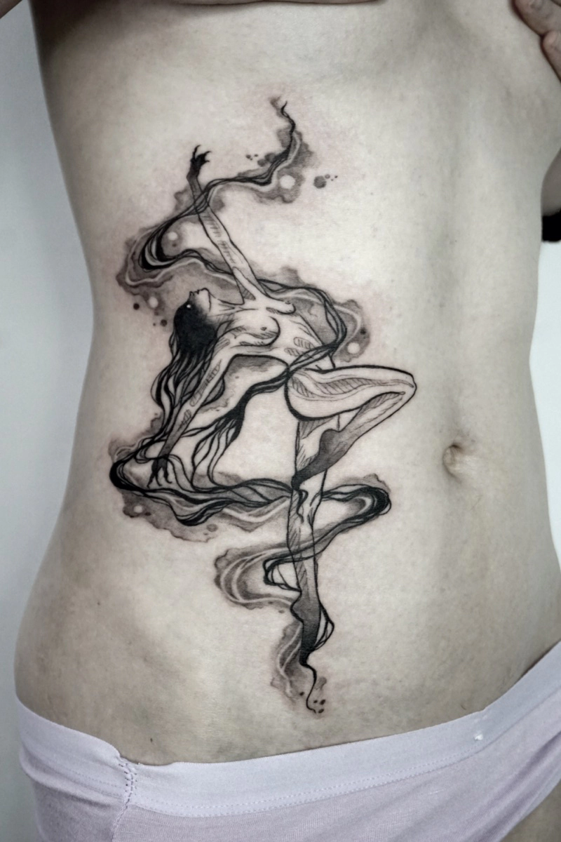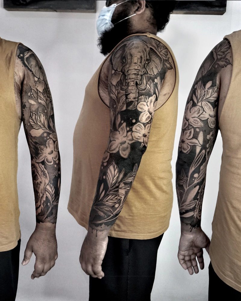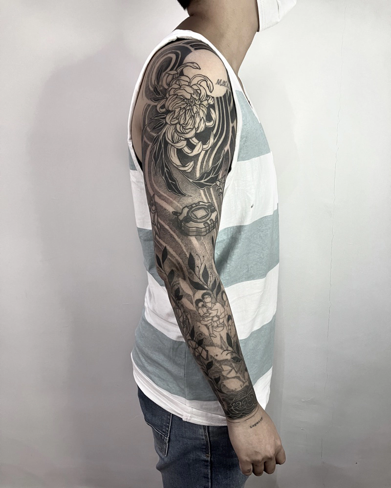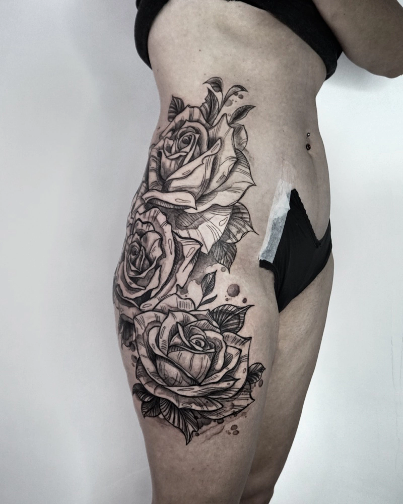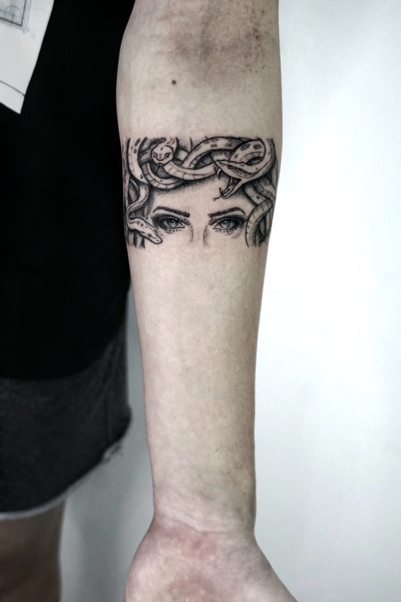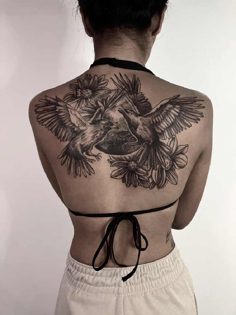 These tattoos are custom designs created in collaboration with each client. Sometimes people come with a clear idea, sometimes just with a theme or feeling. Together we shape it into a design that fits their body and story. Each piece is drawn by hand and tailored to the person who carries it.