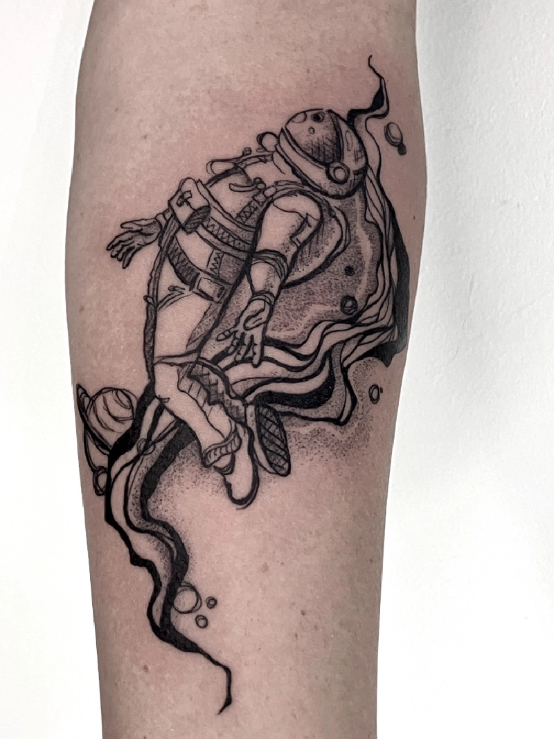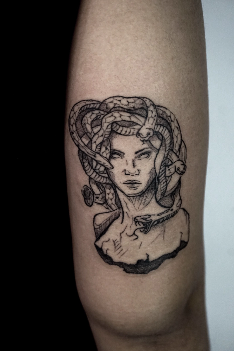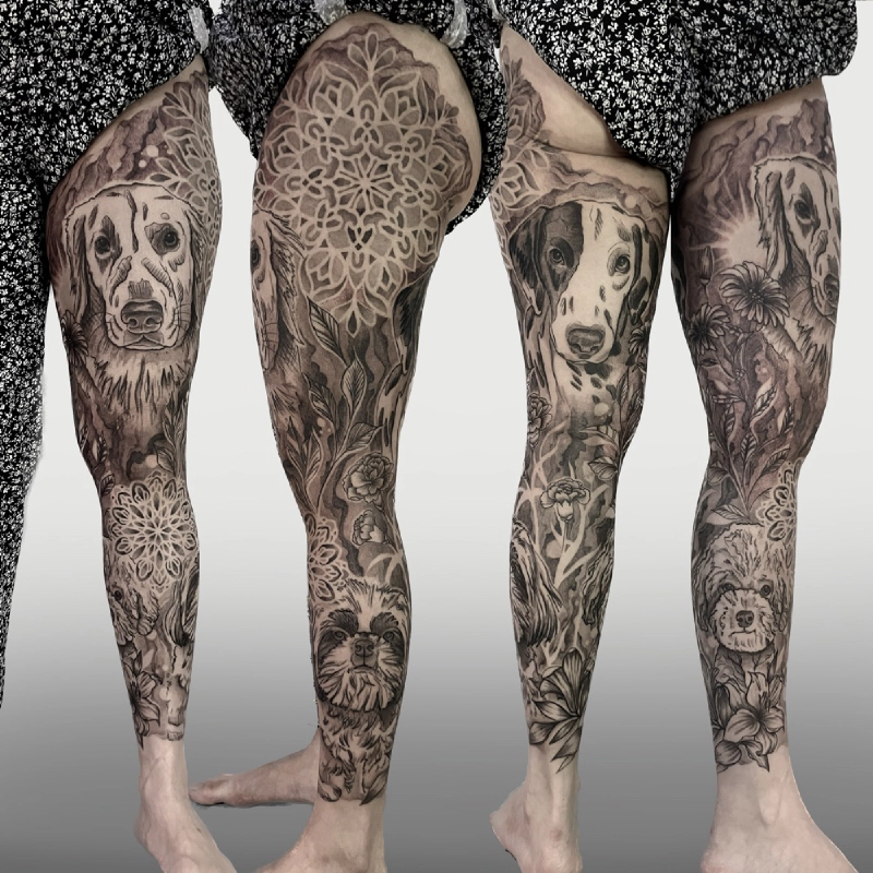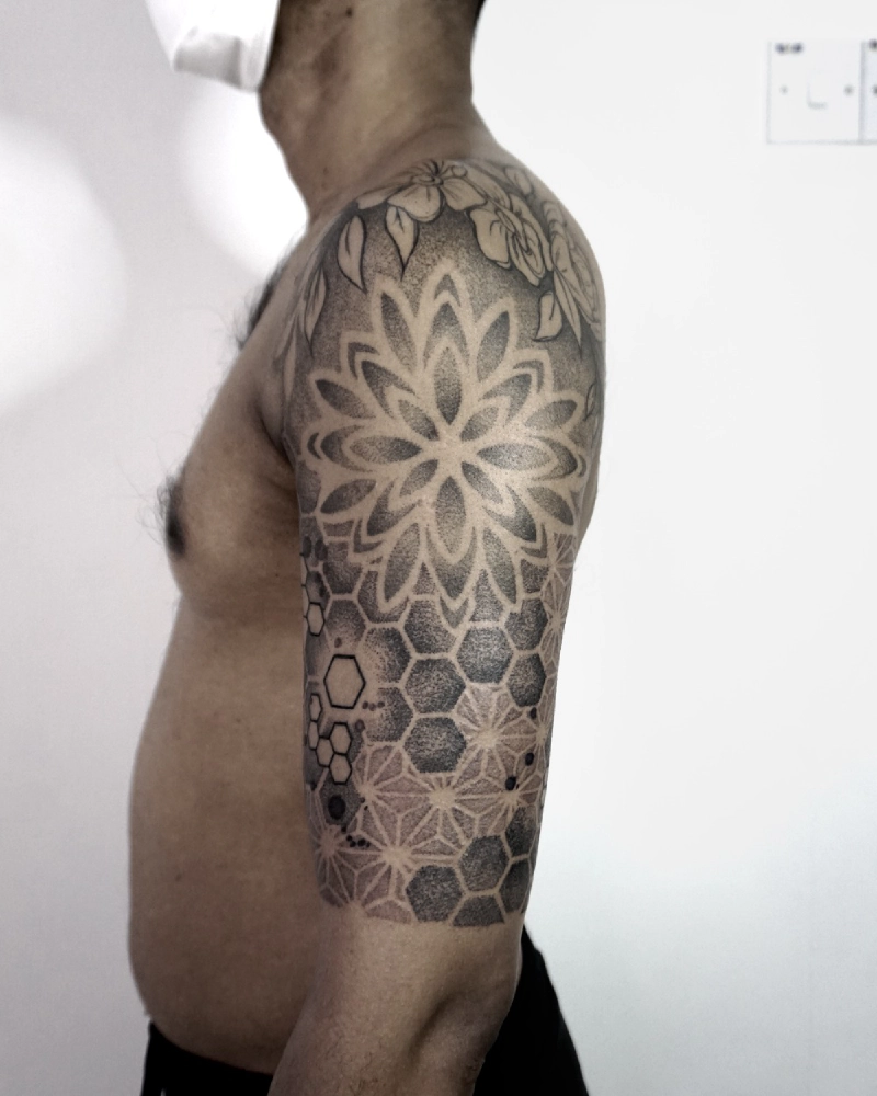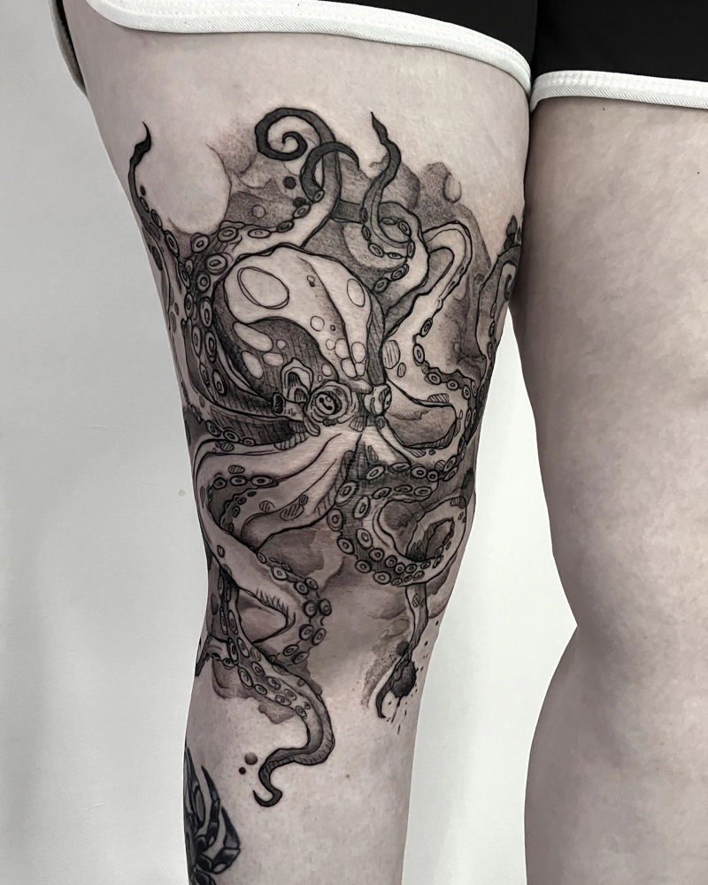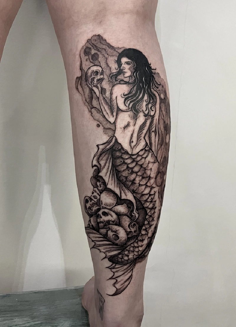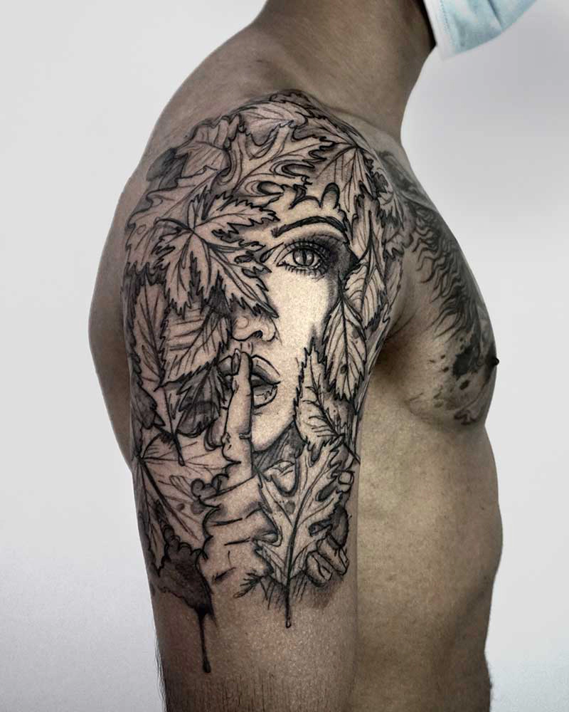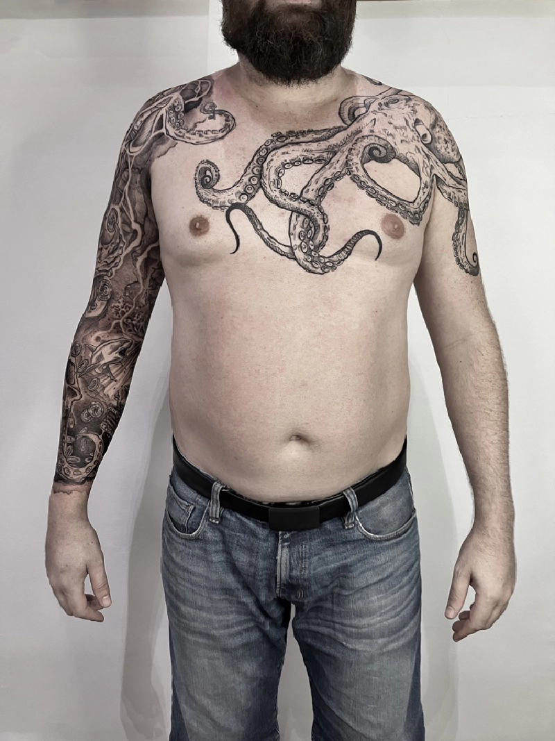 These tattoos are custom designs created in collaboration with each client. Sometimes people come with a clear idea, sometimes just with a theme or feeling. Together we shape it into a design that fits their body and story. Each piece is drawn by hand and tailored to the person who carries it.