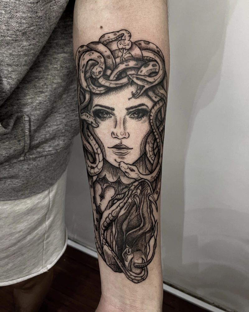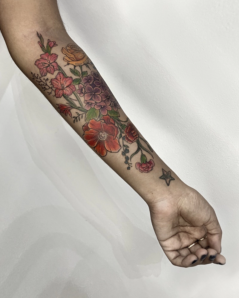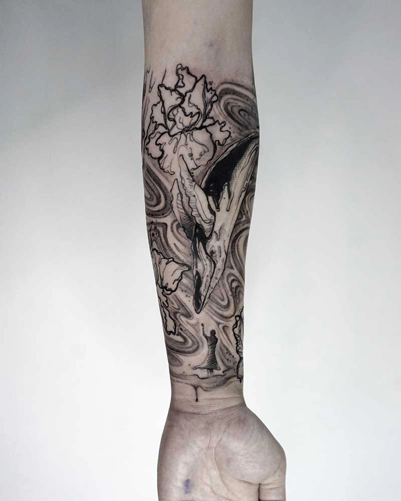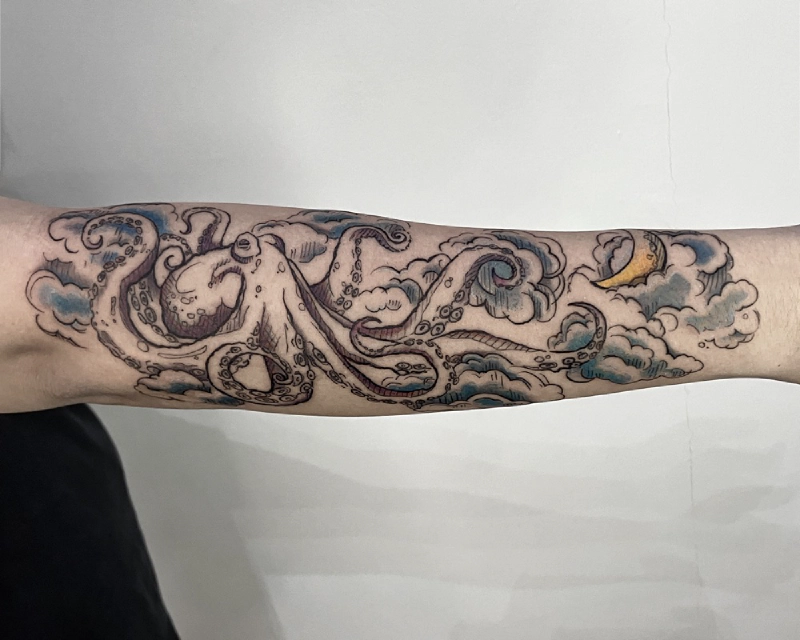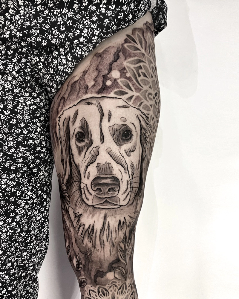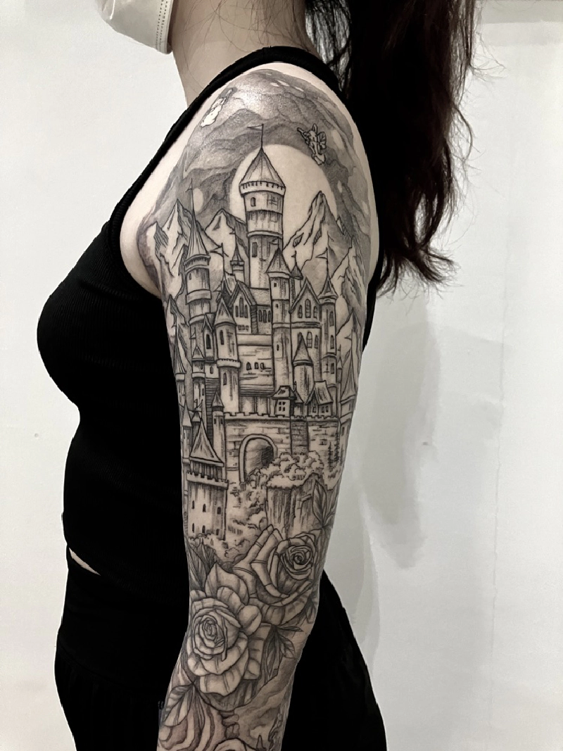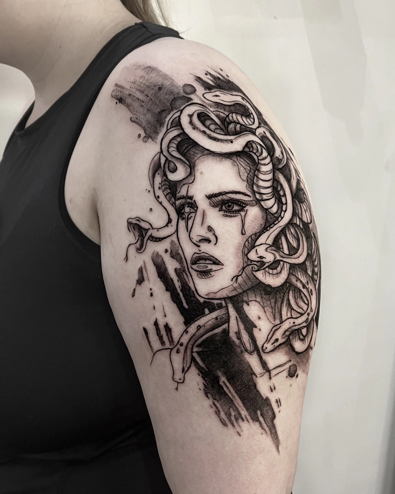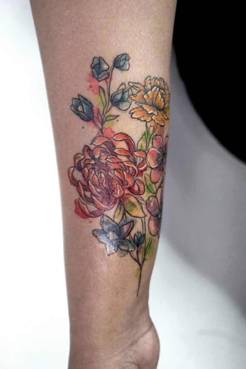 These tattoos are custom designs created in collaboration with each client. Sometimes people come with a clear idea, sometimes just with a theme or feeling. Together we shape it into a design that fits their body and story. Each piece is drawn by hand and tailored to the person who carries it.